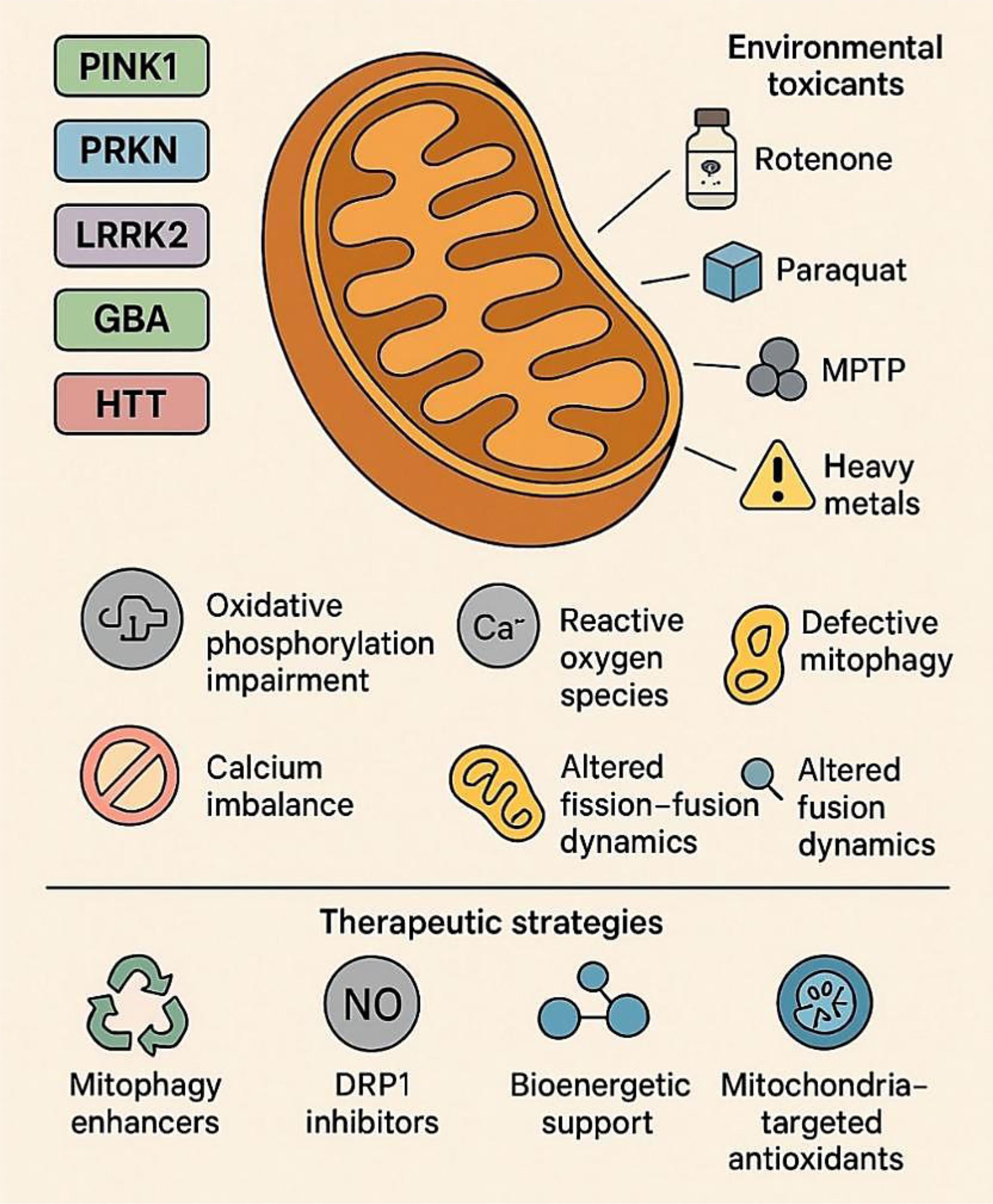 Moreover, mitochondrial dysfunction in PD and HD extends beyond organellar defects to include impaired signaling, biogenesis, proteostasis, and inter-organelle communication. These disruptions collectively compromise cellular energy homeostasis, exacerbate excitotoxic and inflammatory stress, and promote the accumulation of toxic proteins. Mitochondria thus serve as both sensors and amplifiers of neuropathological stress, integrating genetic susceptibilities and environmental exposures.9 This review aims to integrate current knowledge on how genetic mutations, environmental toxicants, and mitochondrial signaling pathways converge in the pathogenesis of PD and HD. By framing neurodegeneration through the lens of the mitochondrial interactome, we seek to highlight shared molecular mechanisms, identify potential therapeutic targets, and propose new directions for precision medicine approaches in neurodegenerative disease management.